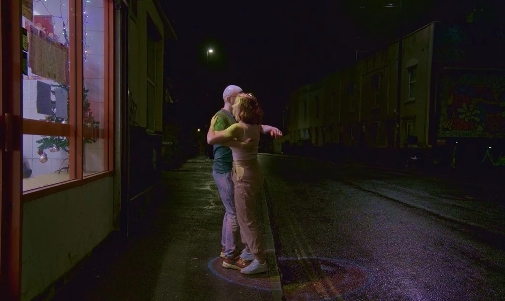 A couple dance under the warm glow of a spotlight advertising a Chinese takeaway. An experimental piece playing with improvisation, public interaction, and the space between public/private, safe/unsafe, pedestrian/driver, art and play.